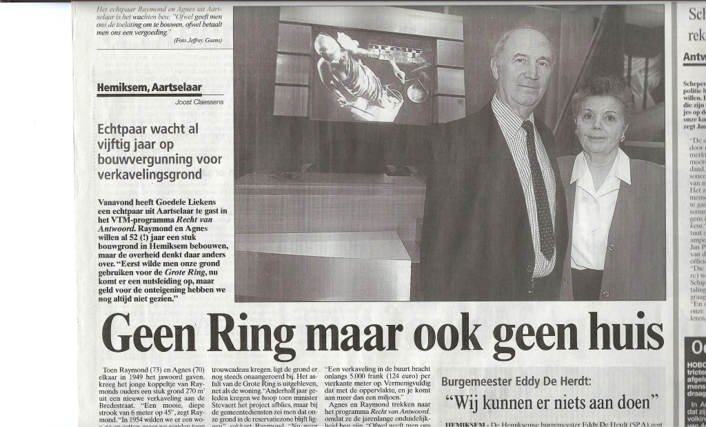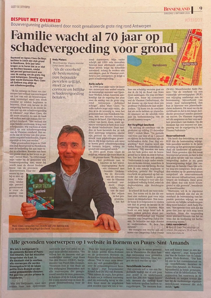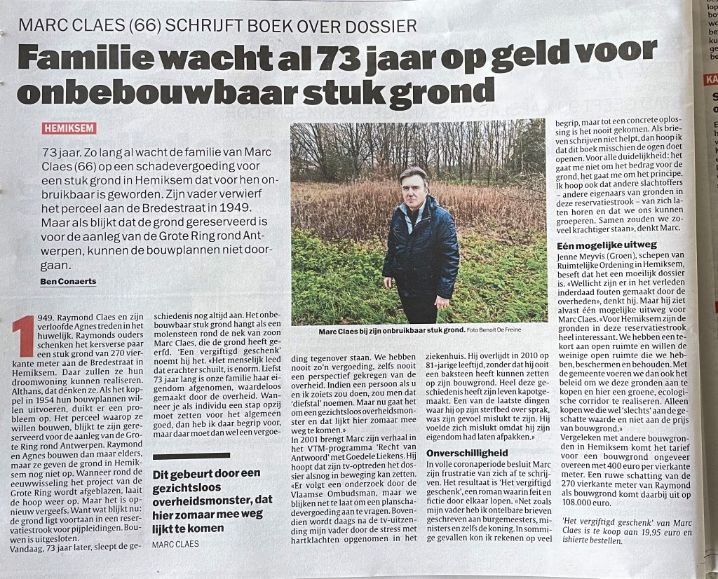 Hoewel het hoofdpersonage een volledig fictief parcours aflegt, is het onderliggende ‘onrecht’, wat in het boek beschreven wordt geen fictie. Het slaat op de situatie waarin mijn ouders terechtkwamen toen ze in 1949 een bouwgrond kregen van mijn grootouders. Toen zij drie jaar later een huis op deze grond wilden bouwen, bleek daar plots ‘DE GROTE RING ROND ANTWERPEN’ op voorzien te zijn. De grond werd dus ‘reservatiegrond’ en daardoor ‘waardeloos’. Een vergoeding voor de geleden schade bleek wettelijk pas voorzien vanaf de werken zouden aanvangen… na 50 jaar werd het duidelijk dat er nooit een GROTE RING ROND ANTWERPEN zou komen, maar werd de bestemming plots veranderd naar ‘RESERVATIEGROND VOOR PIJPLEIDINGEN’.